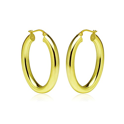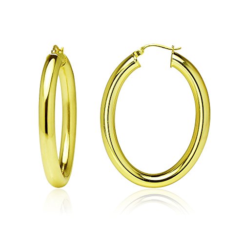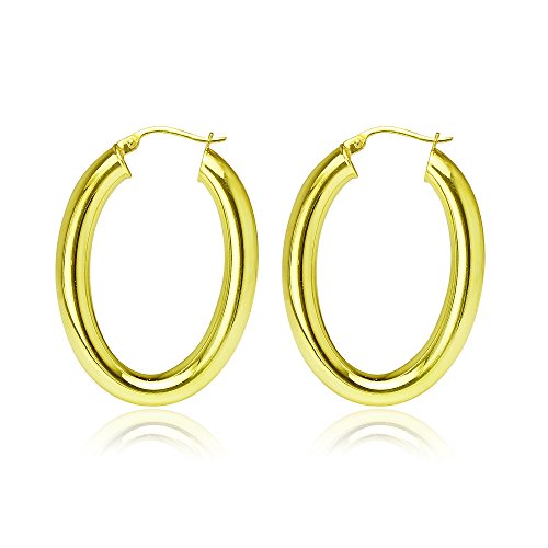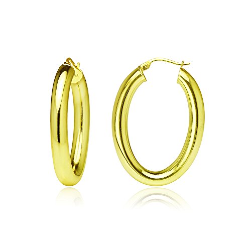 These hoops are 4.5mm in the width and 25mm in the length. They are oval shaped and high polished. They are made of .925 yellow gold flashed sterling silver.
