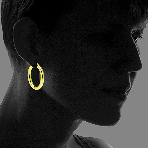 Classic and chic, these beautiful hoop earrings are 4.5mm thick with two length choices: 25mm, 30mm. These hoops are crafted of sterling silver and are secured by post with snap-down backs.
