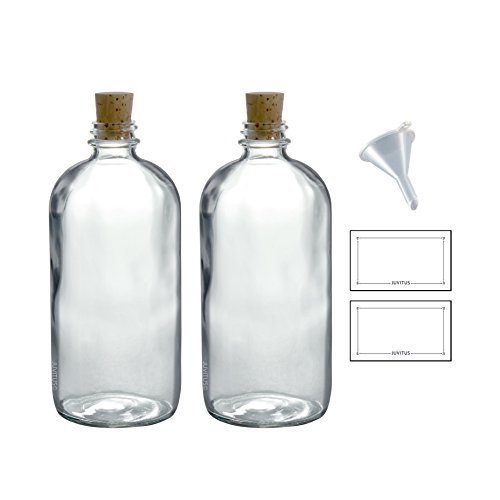 16 oz Clear Glass Boston Round Bottle with Cork Stopper Closure (2 Pack) + Funnel and Labels