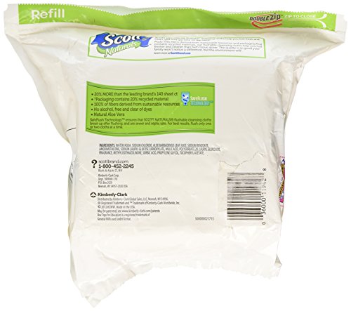 -. Binding : Health and Beauty -. Brand : Scott -. EAN : 0036000119428 -. Feature : Scott Naturals Flushable Cleansing Cloths are made 100% fresh and 100% of fibers are made from sustainable resources / Natural personal wipes have easy one-by-one dispensing / Wipe refill packs make reloading your wipes dispenser tubs simple and easy / Scott flushable moist wipes are septic- and sewer-safe / Scott flushable moist wipes have no alcohol or artifical dyes -. Label : Kimberly-Clark Corp. GMA -. Manufacturer : Kimberly-Clark Corp. GMA -. NumberOfItems : 170 -. PackageQuantity : 1 -. ProductGroup : Pantry -. ProductTypeName : HEALTH_PERSONAL_CARE -. Publisher : Kimberly-Clark Corp. GMA -. ReleaseDate : 2014-04-24 -. Studio : Kimberly-Clark Corp. GMA -. Title : Scott Naturals Flushable Cleansing Cloths Bag 170 -. UPC : 036000119428