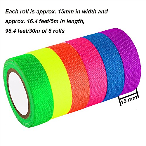 - Dimensions: Each roll is approx. 15mm in width and approx. 16.5 feet/5m in length, 98.4 feet/30m of 6 rolls. UV Blacklight Reactive Neon Gaffer Tape is made of fluorescent cotton cloth, can be torn with ease by hand.