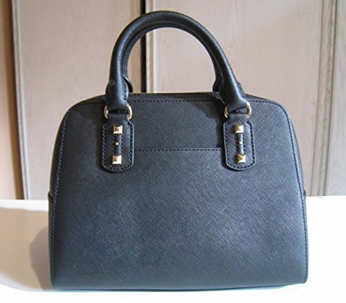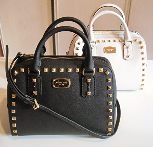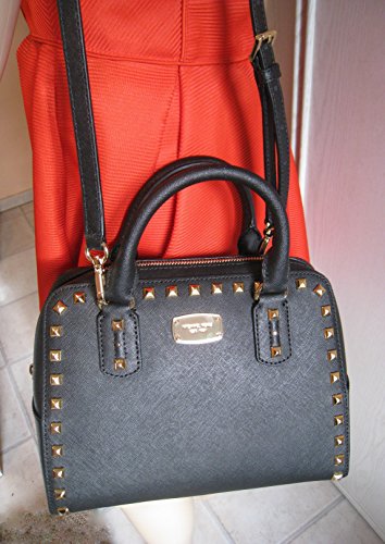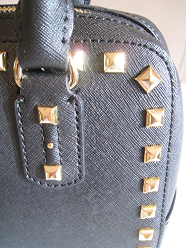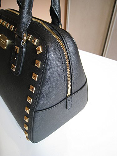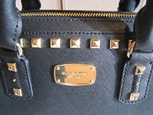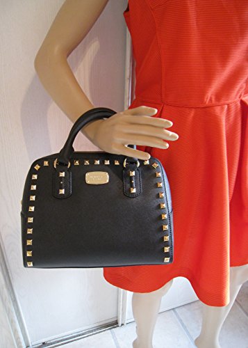 -. Brand : -. Color : Black -. Department : womens -. EAN : 0190049111147 -. Feature : Saffiano Stud Small Satchel Handbag / signature logo plate on front, Accented with pyramid shaped studs / 3.5" drop double handles and 24" drop shoulder strap for crossbody. / The interior is fully lined with MK signature faille and offers a zip pocket and two multi function slide pockets / Approximate Measures : 10" W x 9" H x 6" D -. Model : 35S6GFSS1L -. ProductGroup : Shoes -. ProductTypeName : HANDBAG -. Size : Small -. Title : Saffiano Stud Small Satchel Handbag -. UPC : 190049111147