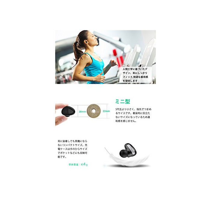 ♬【IPX5방수 쾌적 소형 경량】IPX5방수 구조에 샤워를 뒤집어쓰는 시나 비의 중의 런닝에서도 본체 내부가 침수할 것은 없(아니)다,방진 성능도 있습니다.인간공학 설계에 의해귀가 자연스러운 형상 매우 맞추기 쉬우고,소비되기 어렵다,붙이는 줄 모르는 최고 장착감,장시간 쾌적하게 붙입니다.중량4g(한 쪽)고, 초소형 타입,착장시에 두드러지지 않는 사이즈에 위화감을 느끼지 않습니다.