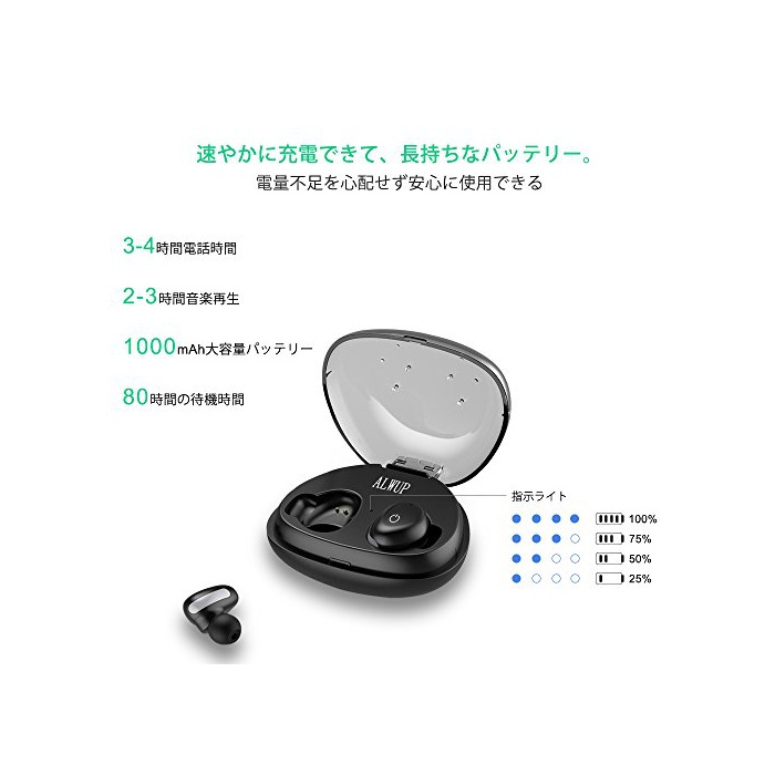 【긴 연속 청취 시간】단1회 30분만한 풀 충전 것만으로,3시간 정도 연속 음악 재생 를 할 수 있습니다.대기 시간은 80시간도 있음.충전 케이스 첨부 와!이어폰을 케이스에 수납할 때는,이어폰과 케이스의 접점을 아울러 충전으로 옵니다.1000mah대 용량 충전 포토에 약5회의 연속 충전 가능!최대 약20시간의 재생 시간을 실현!전양부족을 걱정 하지 않고 안심하고 사용 하실 수 있습니다.