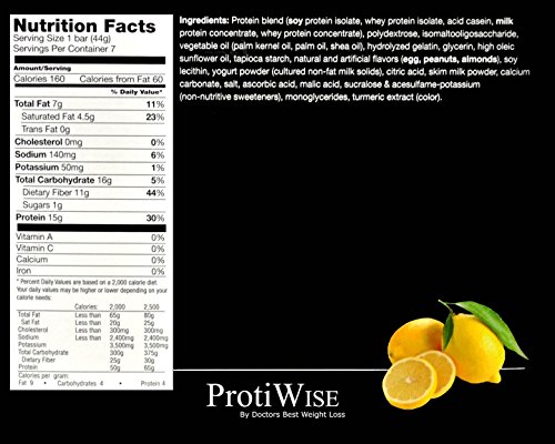 -. Binding : Health and Beauty -. Brand : ProtiWise - By Doctors Best Weight Loss -. EAN : 0753677576391 -. Feature : High Protein - 15 grams Per Bar / Low Calorie - 160 Calories Per Bar / Low Fat - 7 grams Per Bar / Low Sugar -1 gram Per Bar / Medical Grade & Sold in Many Weight Loss Centers -. IsAdultProduct : 0 -. Label : Doctors Best Weight Loss -. Manufacturer : Doctors Best Weight Loss -. PackageQuantity : 7 -. ProductGroup : Health and Beauty -. ProductTypeName : HEALTH_PERSONAL_CARE -. Publisher : Doctors Best Weight Loss -. Studio : Doctors Best Weight Loss -. Title : ProtiWise - Zesty Lemon Crisp High Protein Diet Bars 7 pack 1.6 oz bars -. UPC : 753677576391