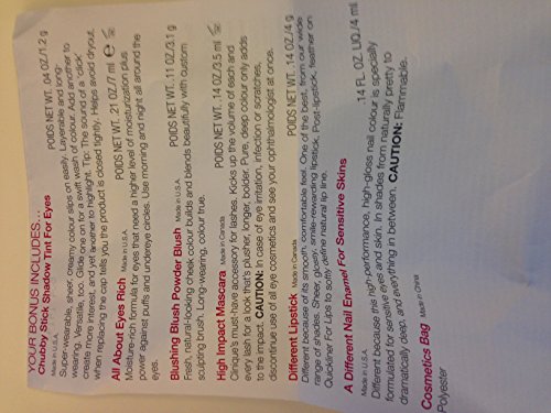 -. Feature : 1. Chubby Stick Shadow Tint For Eyes 1.2g / 2. All About Eyes Rich 7ml; 3. Different Lipstick 4g; / 4. Blushing Blush Power Blush 3.1g; 5. High Impact Mascara; / 6. A Different Nail Enamel For Sensitive Skins; 7. Cosmetics Bag