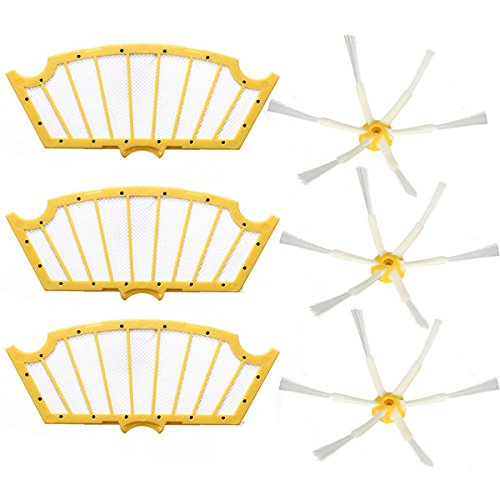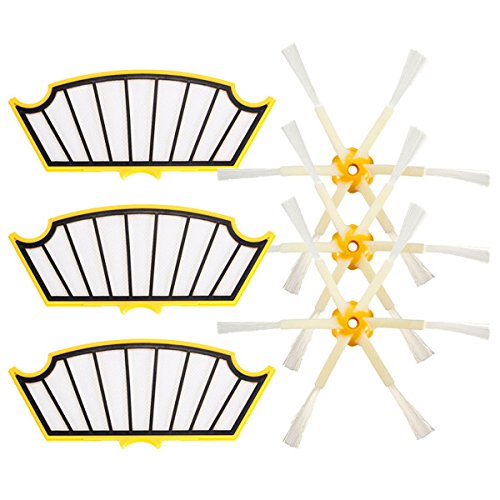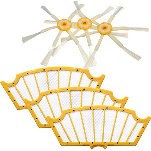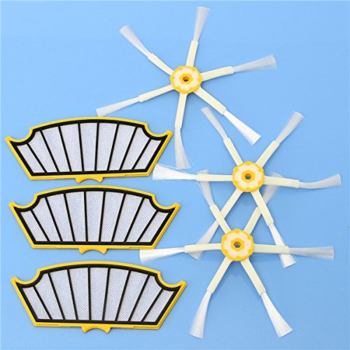 Features: 1. The innovative brush reaches deep into corners and edges to remove more dirt, dust and debris.It can be easy to remove and replace as part of routine maintenance. 2. Filters maintain Roomba's cleaning performance while reducing infiltration of dust, pollen and other allergens into the air you breathe. For best results, filters should be replaced every 2 - 3 months. 3. Excellent quality accessories for iRobot Roomba Cleaner. Package Included: 3 x 6-Armed Side Brushes 3 x Vac Filters More Details: