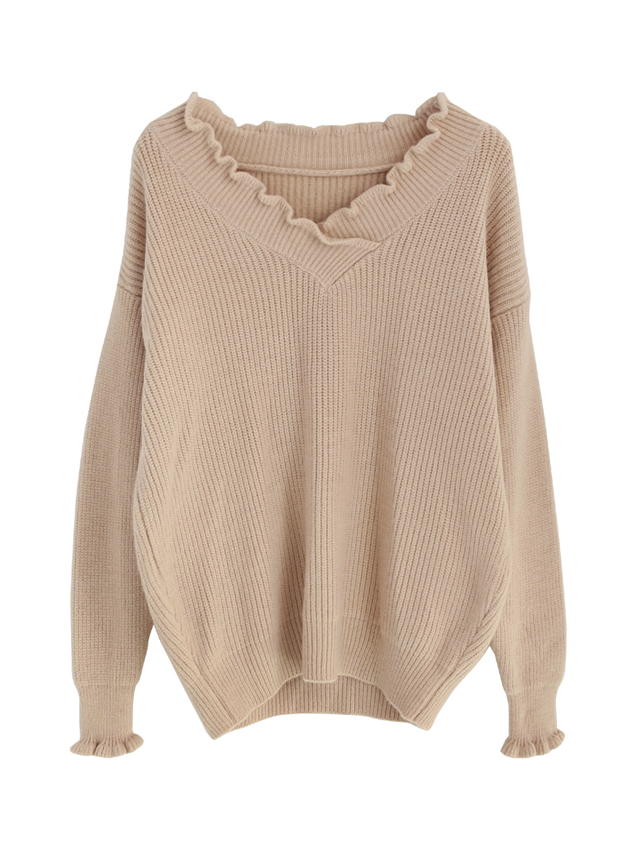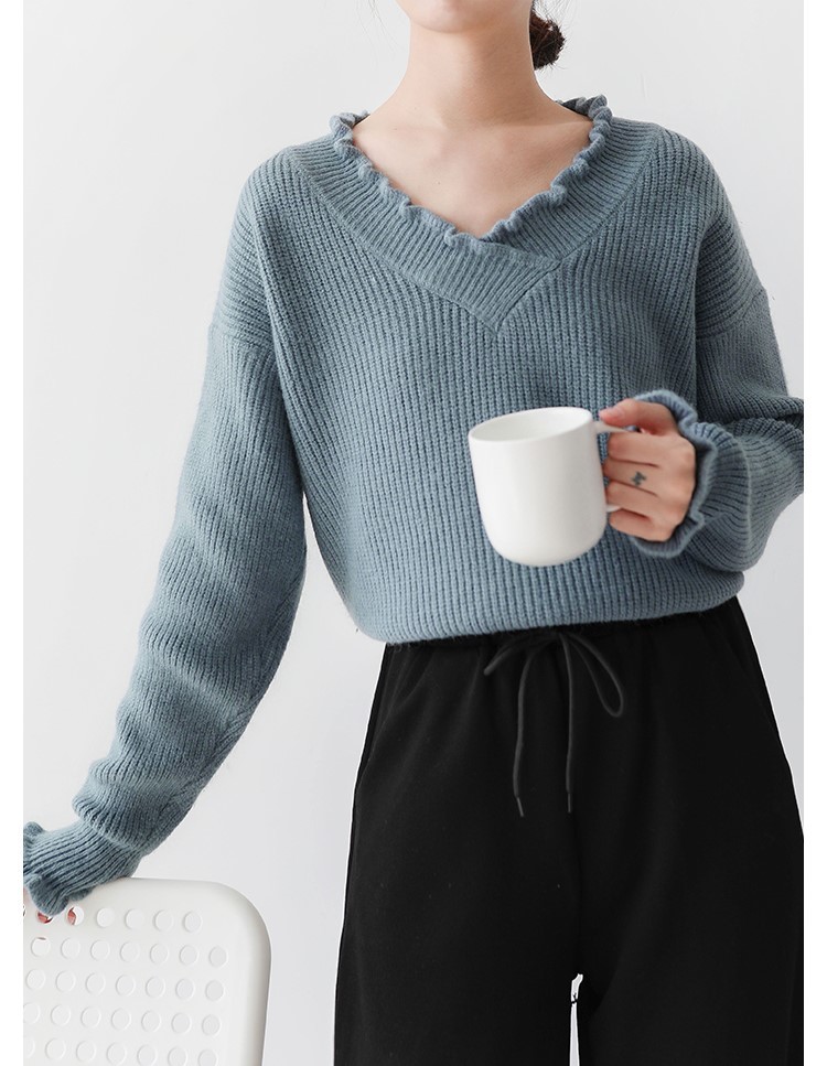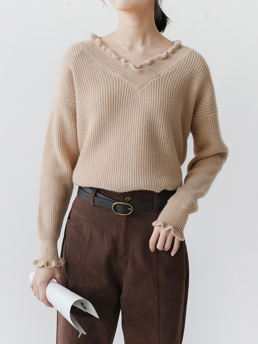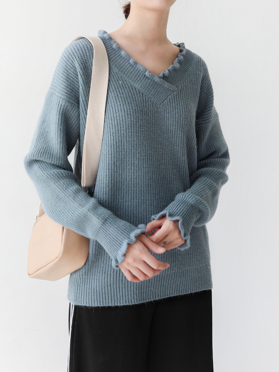 袖と襟元のフリルがガーリーなデザインのニットトップスです。
