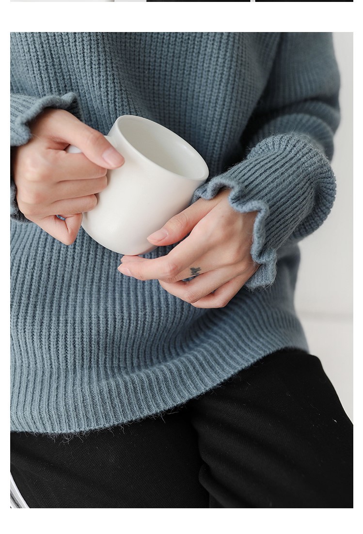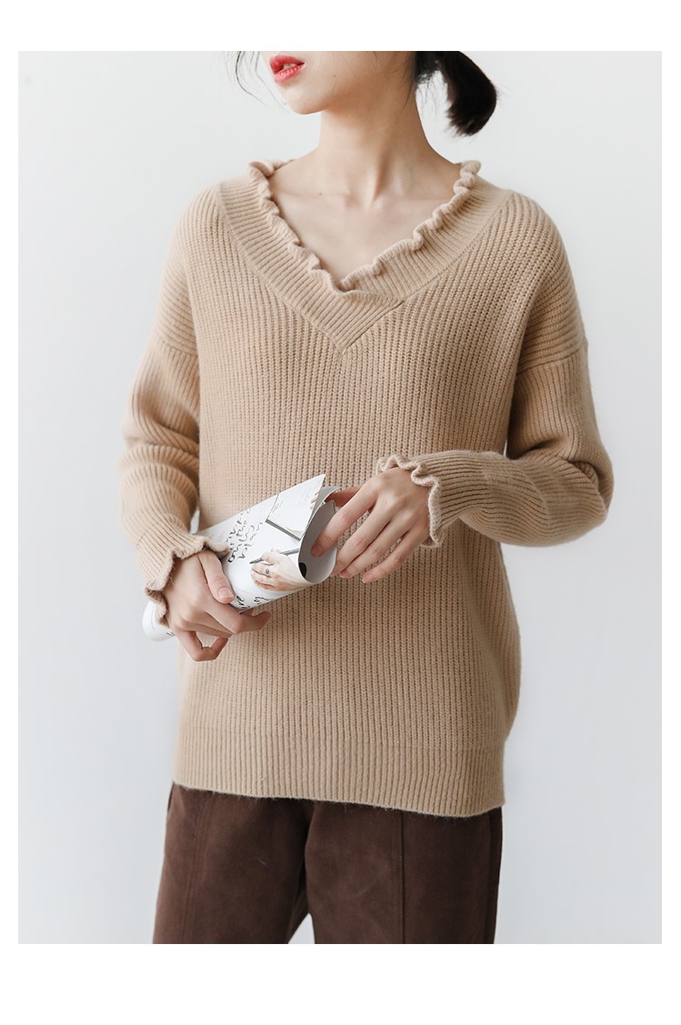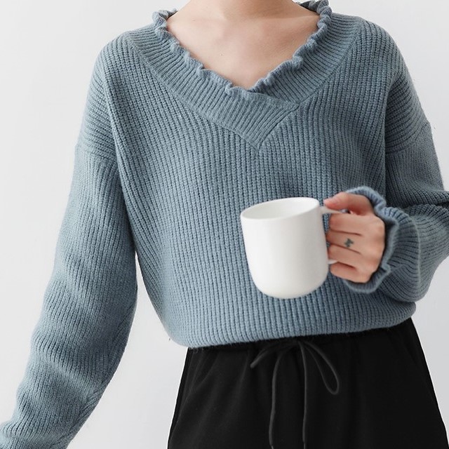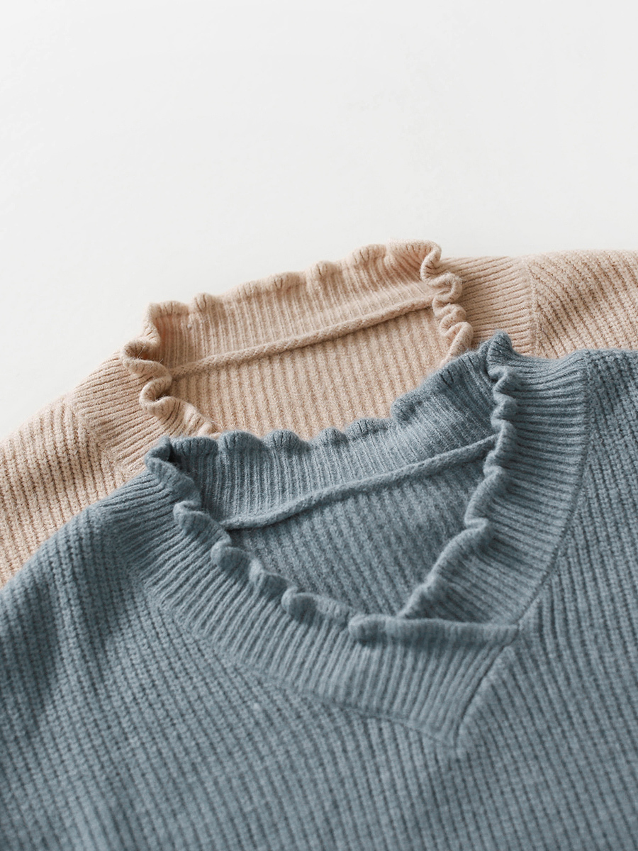 袖と襟元のフリルがガーリーなデザインのニットトップスです。