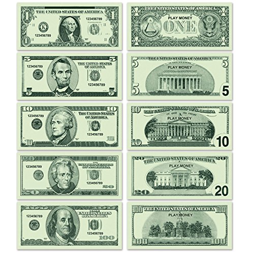 - Includes 200 pieces of play money in package; 40 pieces each of $1, $5, $10, $20 and $100 Bills