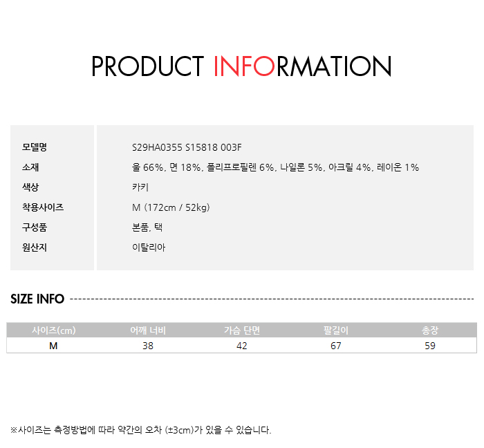 소재울 66%, 면 18%, 폴리프로필렌 6%, 나일론 5%, 아크릴 4%, 레이온 1%