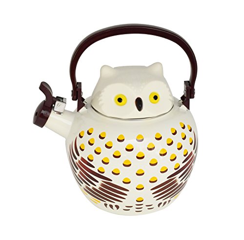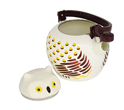 Introducing charming and eye-catching Owl style enamel teakettle. Made of enamel on steel (both inside and outside of teakettle) and a handle, spout, and lid knob are made of durable plastic. It can be used on gas, electricity, radiant, halogen, or ceramic heating sources. Hand washing recommended. Capacity is 2.1 quart.