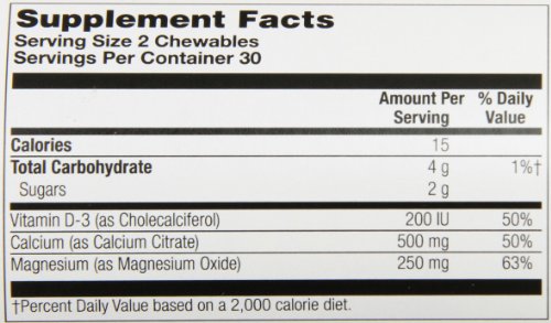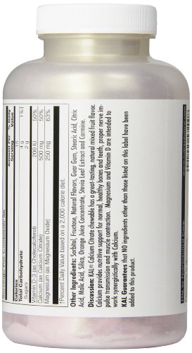 Kal calcium citrate chewable contains calcium that provides nutritive support for normal, healthy bones and teeth, proper nerve impulse transmission, and muscle contraction