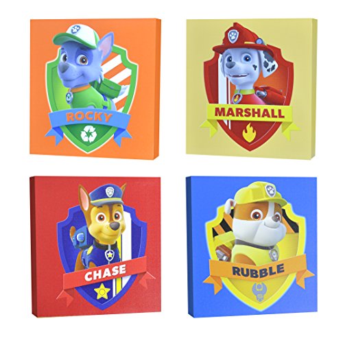 -. Binding : Toy -. Brand : Nickelodeon -. Color : Red, Green, Yellow, Blue -. EAN : 0784857635799 -. Feature : Each square canvas features a Paw Patrol Character! / Set includes 4 canvases / Can stand alone or as part of a set / No assembly required - canvas material is easy to mount / Dimensions of each piece: 11" L x 11" H x 1" W -. IsAdultProduct : 0 -. Label : Idea Nuova - LA -. Manufacturer : Idea Nuova - LA -. Model : NN350051 -. MPN : NN350051 -. PackageQuantity : 1 -. PartNumber : NN350051 -. ProductGroup : Toy -. ProductTypeName : TOYS_AND_GAMES -. Publisher : Idea Nuova - LA -. Studio : Idea Nuova - LA -. Title : Nickelodeon Paw Patrol Square Canvas Wall Art 11" Toy (Pack of 4) -. UPC : 784857635799 -. Warranty : No Warranty