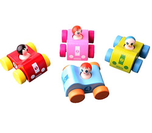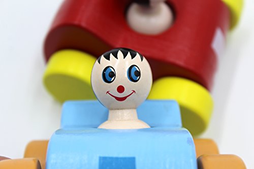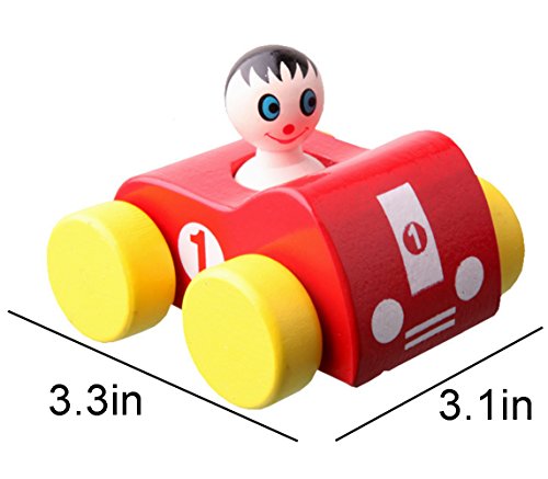 Stimulates Sense of Hearing: wooden car with a funny driver, when you press the driver head button and it will turn around head and sould "BB" voice.It can stimulate baby's sense of hearing and touch. Baby can also improves her fine motor skills and hand-eye coordination