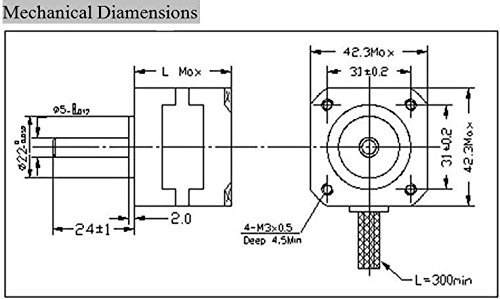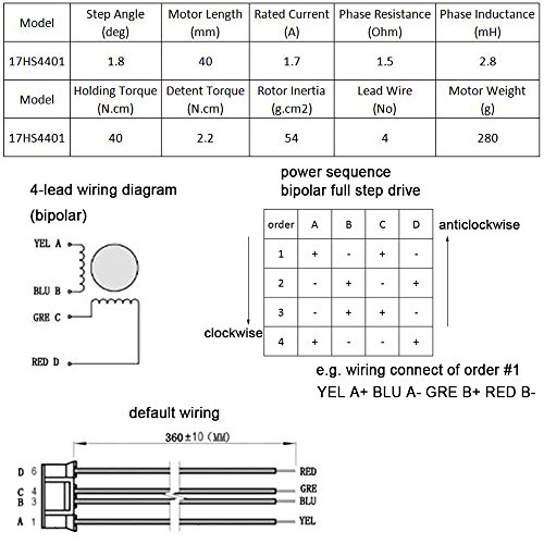 NEMA 17 bipolar 4-wire: Yellow A +, blue A-, green B +, Red B-; wire length: 14 inches