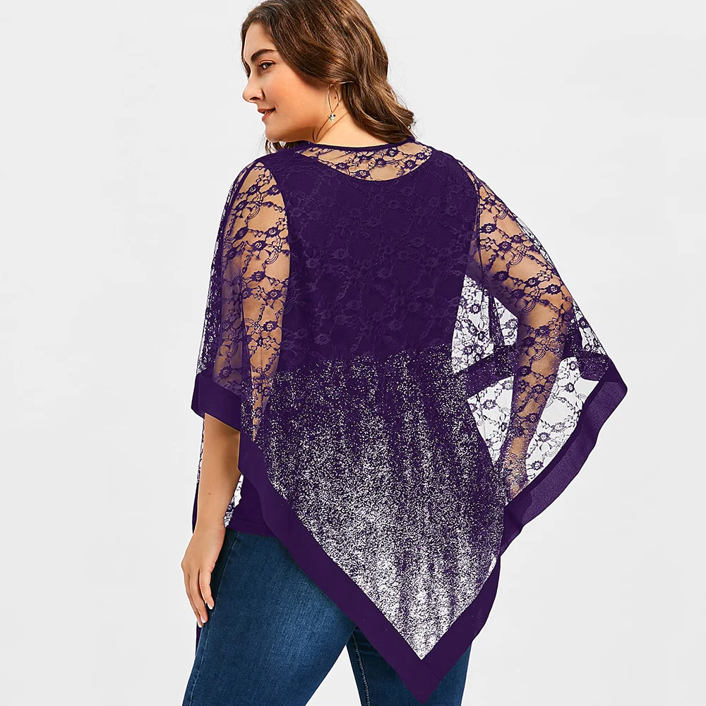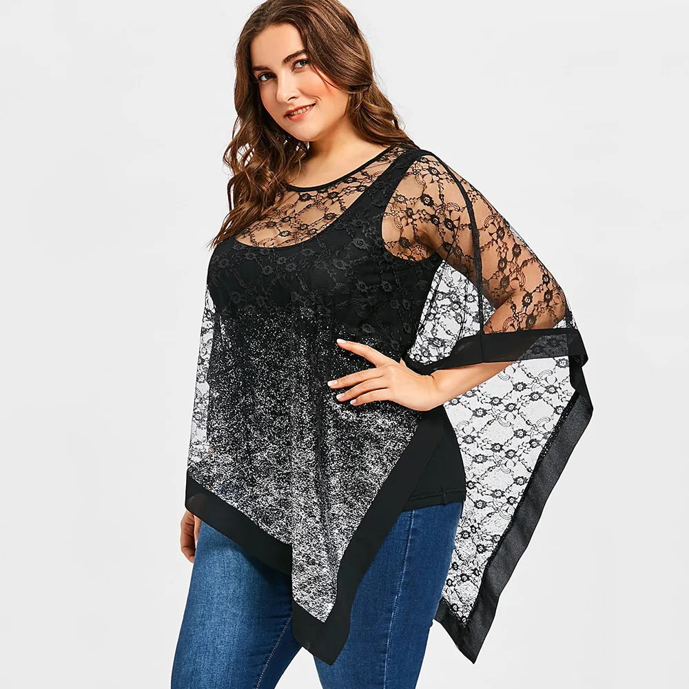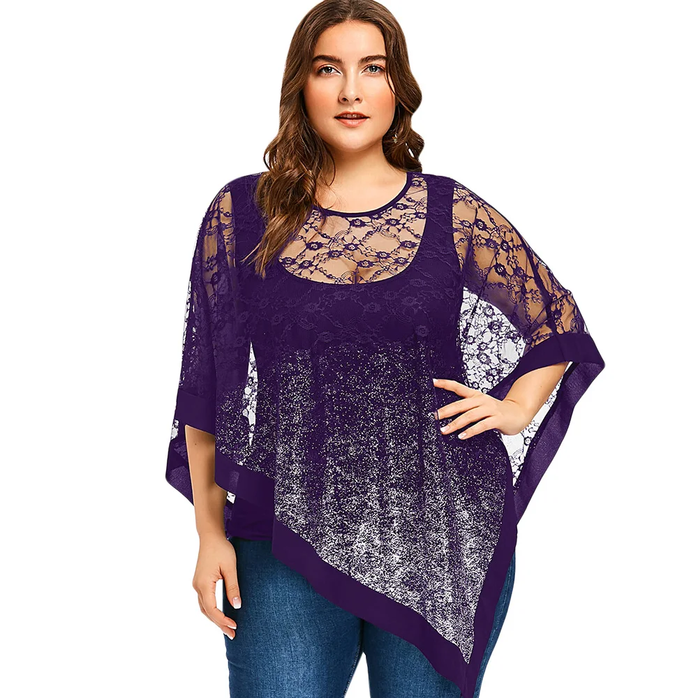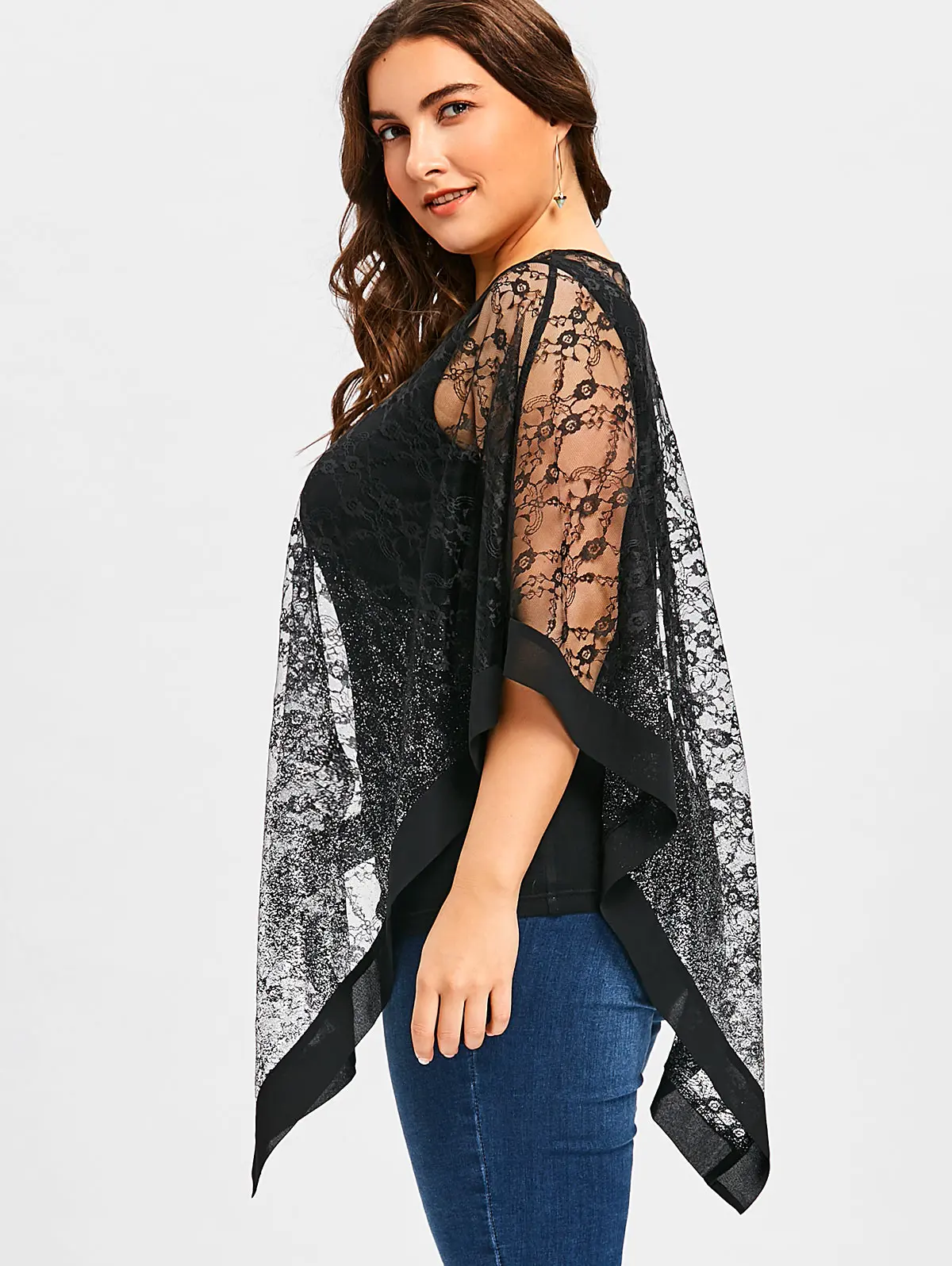 Model Number:Plus Size Sheer Asymmetric Lace Overlay Blouse