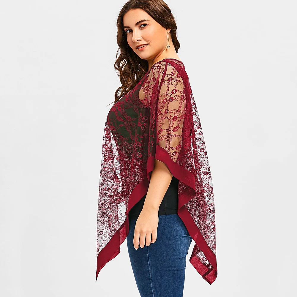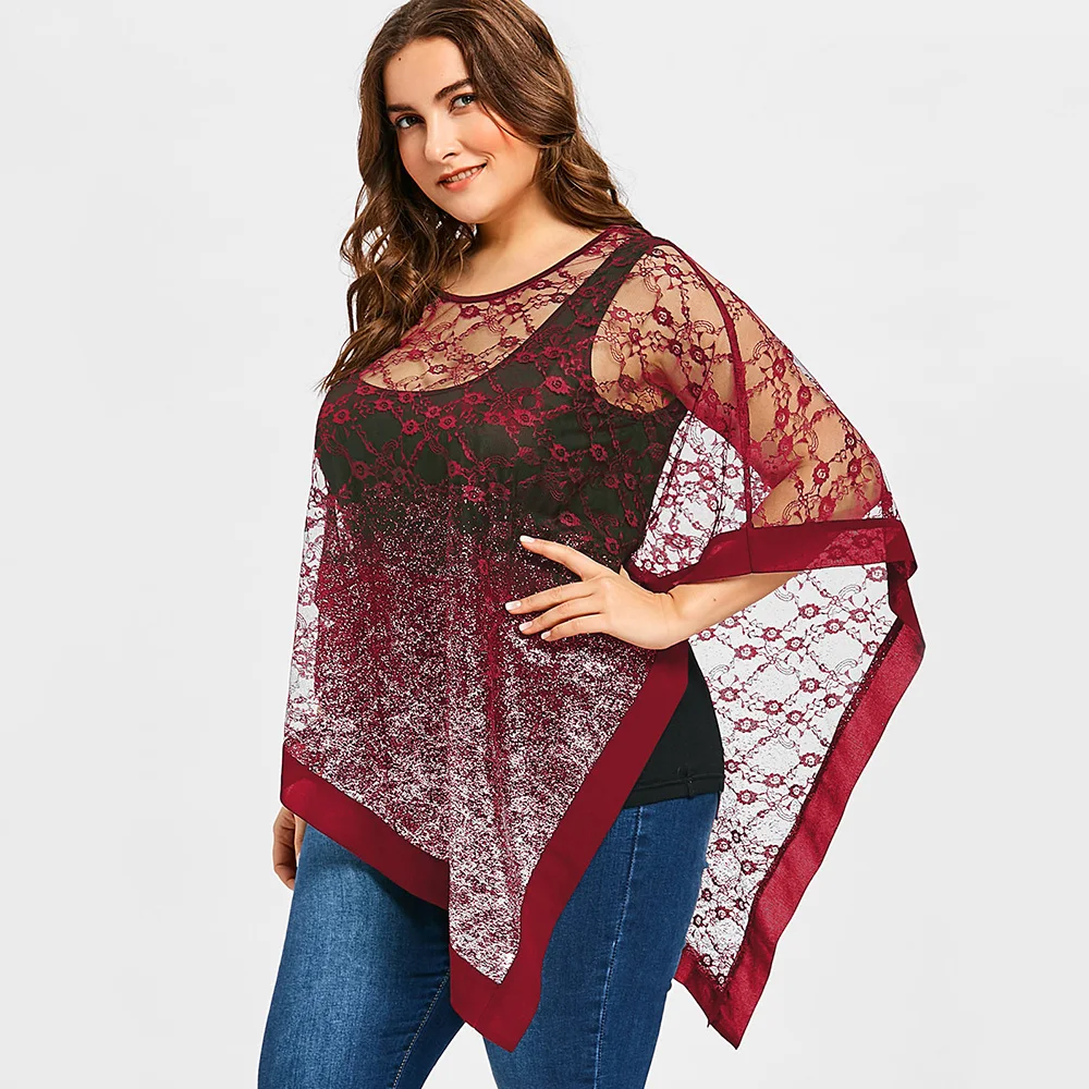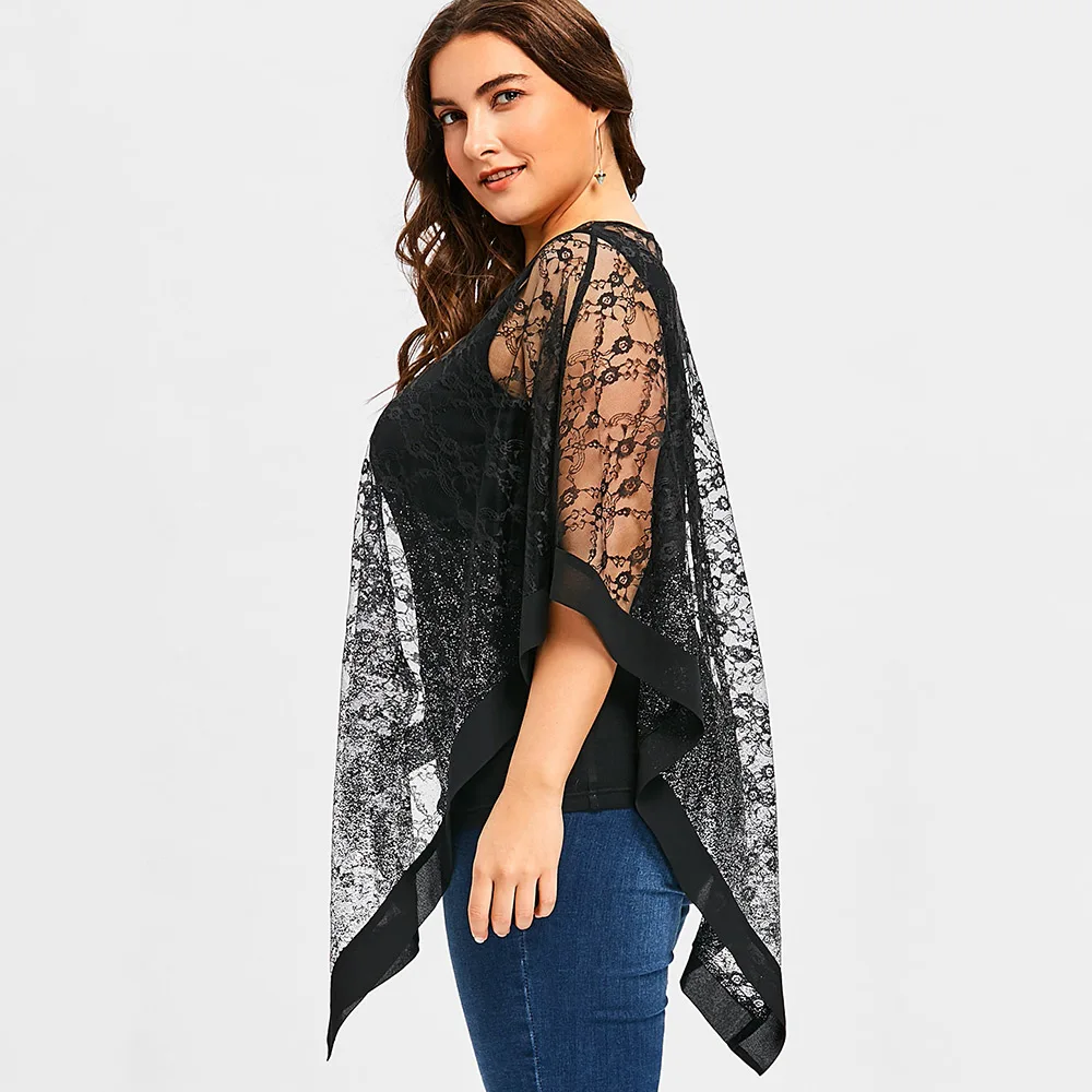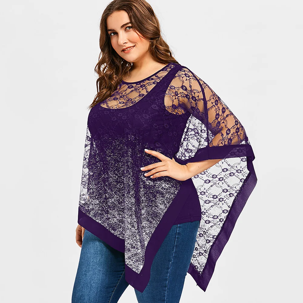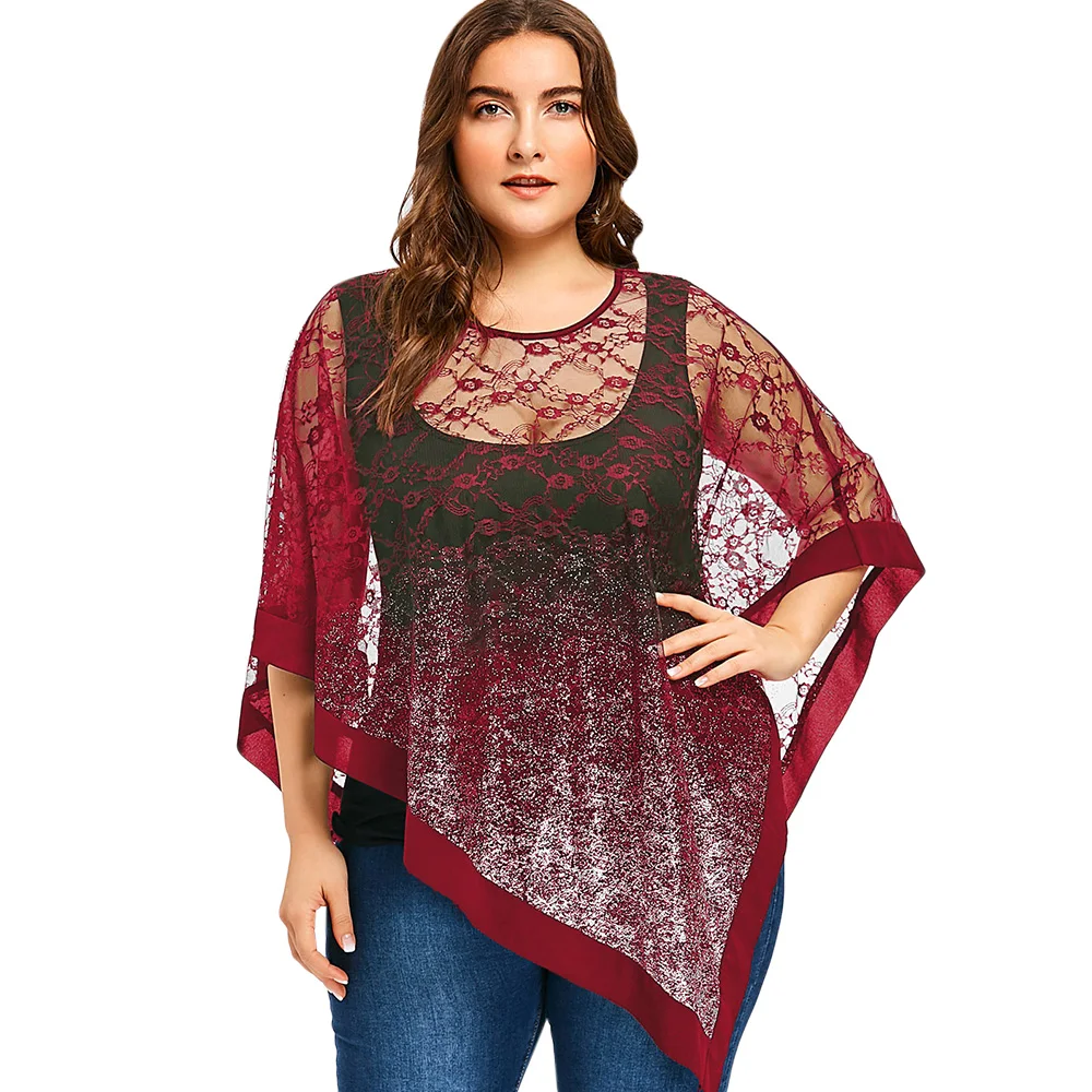 Model Number:Plus Size Sheer Asymmetric Lace Overlay Blouse