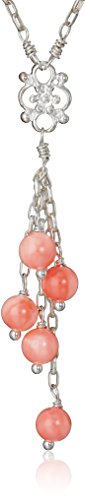 The natural beauty of coral jewelry takes on a metallic twist with the Light Pink Coral Bead Dangle Sterling Silver Necklace. At the bottom of this simple 18-inch cable chain necklace rests a cluster of five smooth light pink coral beads. The beads each hang from a cable chain attachment, creating an elegant dangle necklace design that. The additional sterling silver floral chain allows the necklace to display a romantic look.