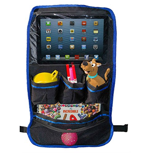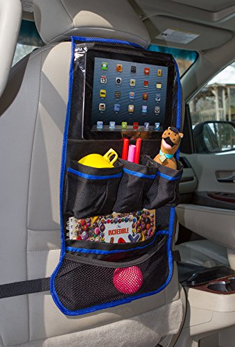 -. Feature : Protective, extra-large plastic top pocket holds iPad and Android Tablets up to 10 inches. / The storage organizer fits most cars, SUVS, and trucks, and can even fit over large strollers. / Five roomy pockets hold sippy cups, bottles, toys, snacks, wipes, coloring items, books, and more. / Made of durable, washable, polyester in an attractive gray with blue trim. Can be wiped clean. / Easy to install with a top strap and a four-foot bottom strap to secure to even oversized car seats.