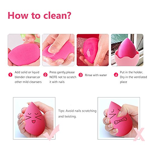 How to Clean Makeup Sponge? Step 1:Add solid or liquid blender cleanser,baby shampoo,or other mild cleansers Step 2:Press gently,please NOTE not to scratch it with nails Step 3:Rinse with water Step 4:Put in the holder,Dry in the ventilated place,Don't expose them to the sun(Dry time will last about 5-6 hours and it depends on how much water it absorbed) 0