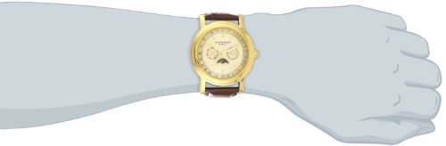 -. Feature : Multifunction features include day, date, and moon phase (am/pm indicator) sub dials / Gold-tone, luminescent, hands and hour markers / Gold-tone, stainless steel, case with brown, genuine leather, strap / Precise quartz movement / Water resistant to 99 feet (30 M): withstands rain and splashes of water, but not showering or submersion