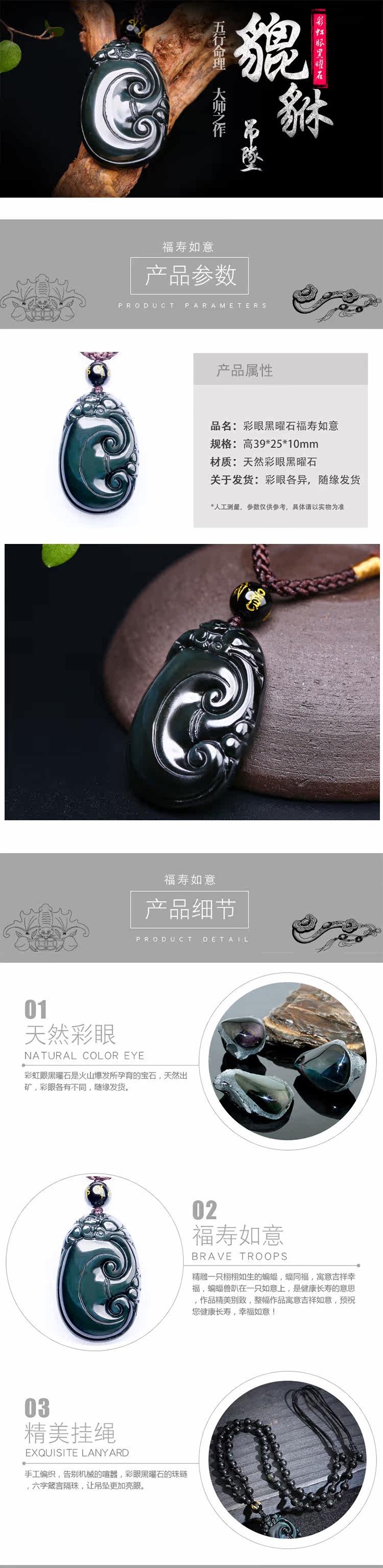 开光天然彩虹眼黑曜石金耀石貔貅如意吊坠男女情侣款项链招财转运