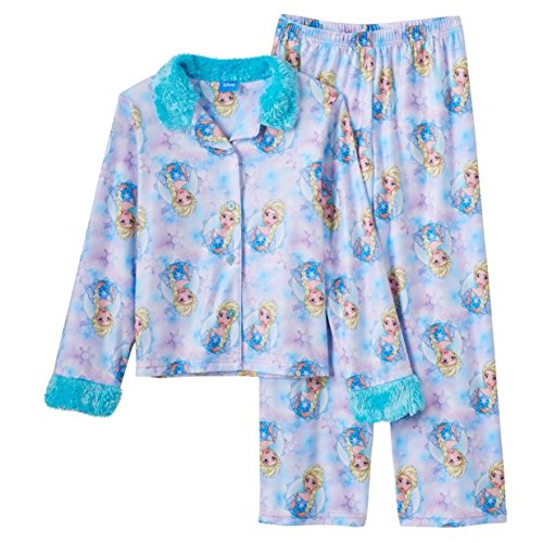 These pajamas will please any Frozen fan, and feature Frozen's Princess Elsa. With traditional button front coat styling and elastic waist pull on pants, these brushed polyester jammies are cozy and warm and perfect for snuggling up to watch her favorite movie on the couch. Furry trim details make this pajama extra special.Feature