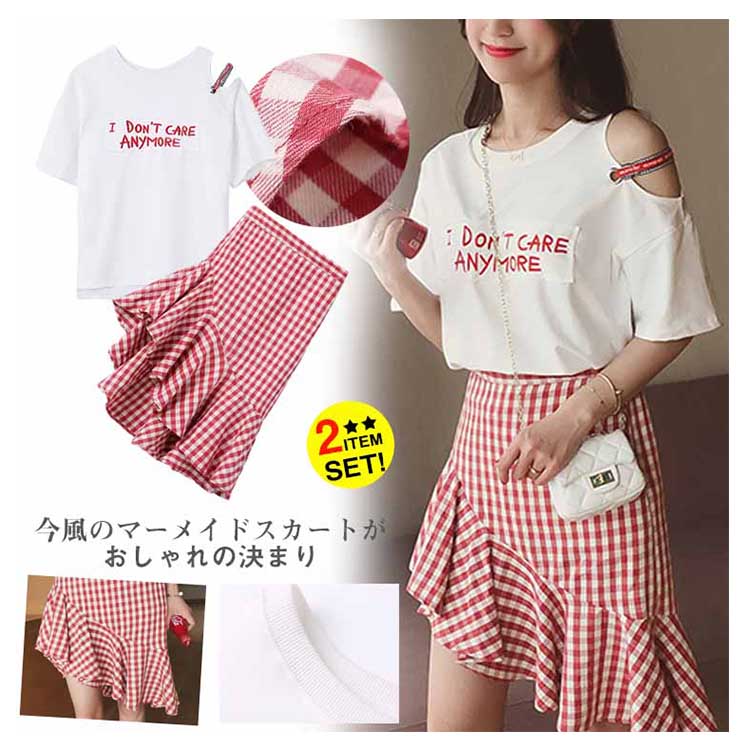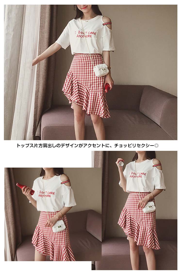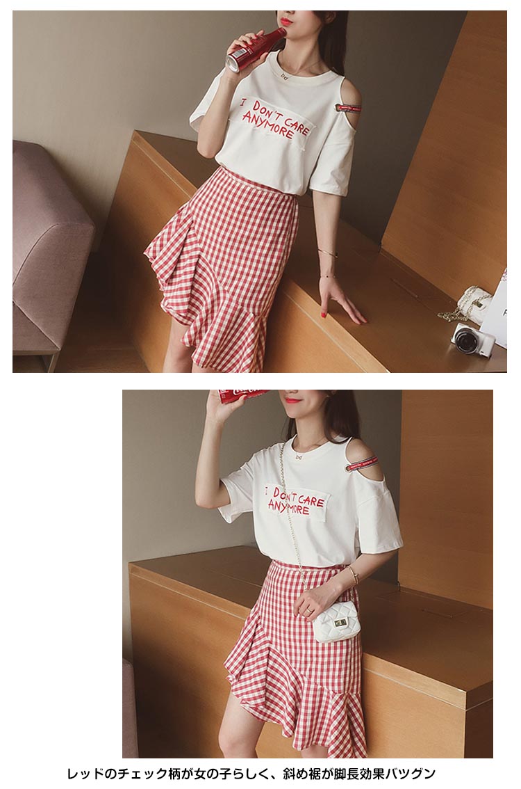 | 今風のマーメイドスカートがおしゃれの決まりレッドのチェック柄が女の子らしく、斜め裾が脚長効果バツグントップス片方肩出しのデザインがアクセントに、チョッピリセクシー◎デートや旅行などに絶対注目され、大活躍に間違いなしの優秀アイテム | |