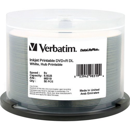 Verbatim DVD+R DL 8.5GB 8X DataLifePlus White InkJet Printable, Hub Printable, 50 Disc Spindle 98319