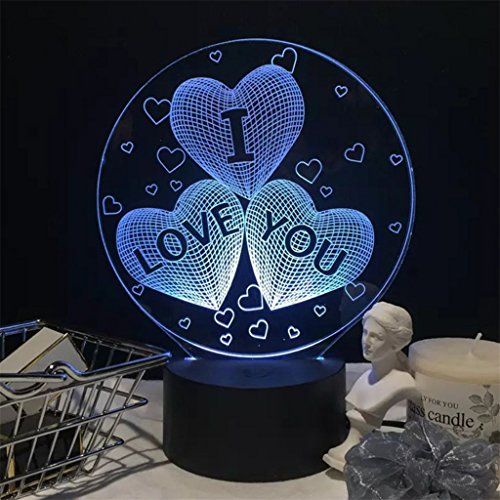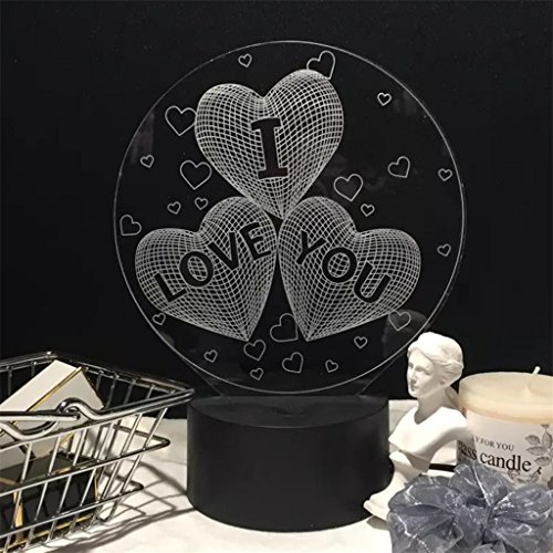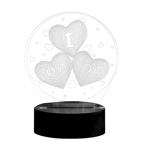 -. Feature : Featuring three hearts and I LOVE YOU letter design with 3D visual effect. / It can be put in bedroom, child room, living room, bar, shop, cafe, restaurant and so on as decorative light. / It could be a wonderful Valentine's Day gift. / Power Supply: USB Charging/3 x AA Batteries(Not Included) / Base Diameter: 9.5cm/3.74" (Approx.) .Package Includes: 1 x 3D Illusion Light 1 x USB Cable 1 x Panel