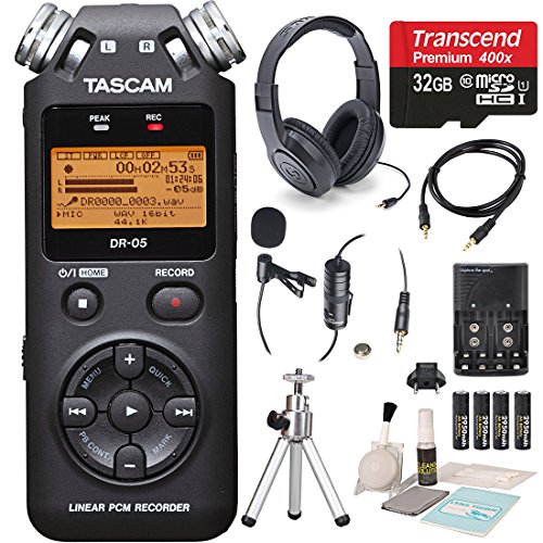Deluxe accessory bundle contains a professional lavalier condenser microphone, sturdy table tripod, 32GB MicroSDHC memory card, Samson stereo headphones, cleaning accessories, and 4 AA rechargeable batteries with a charger