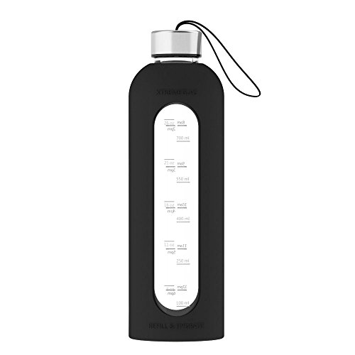 32 Oz Glass Water Bottle Leak Proof Time Marked Reusable Perfect For Essential Oils Eco Friendly BPA Free Drink More Water Comes With Silicone Sleeve and 2 Lids - ALL NEW Xtremeglas Hydrate
