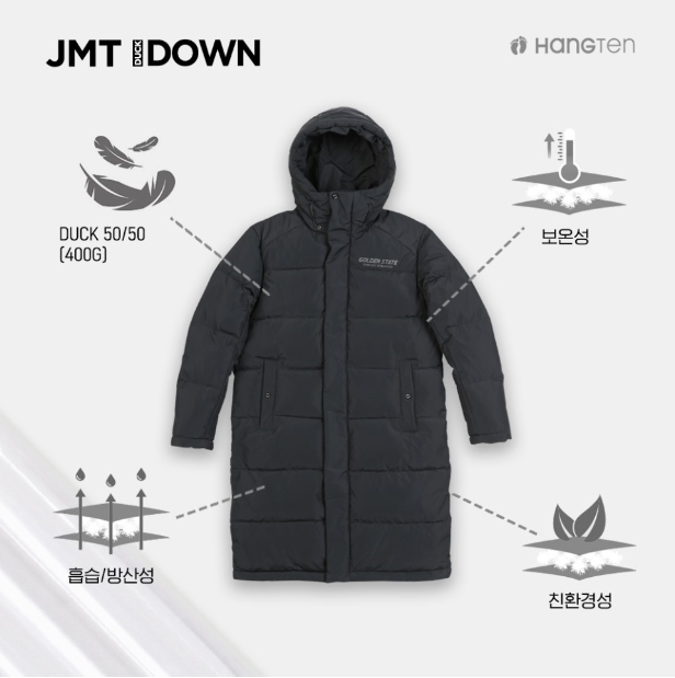 소재겉감-폴리에스터 100%, 충전재- 오리솜털 50%, 오리깃털 50%