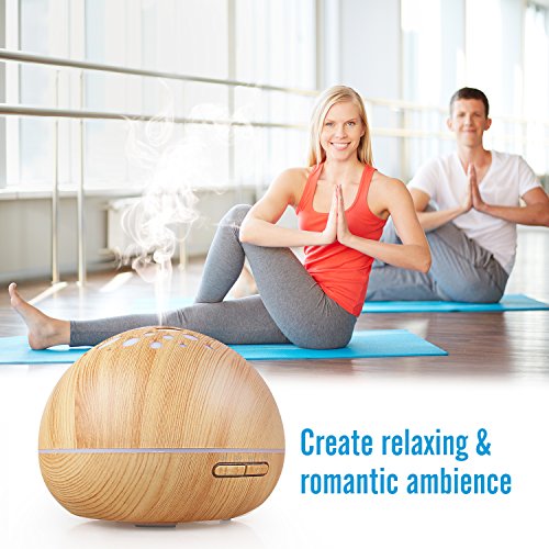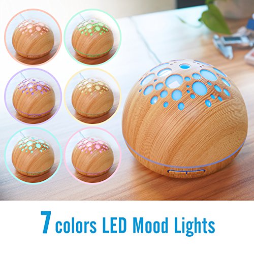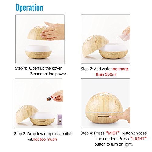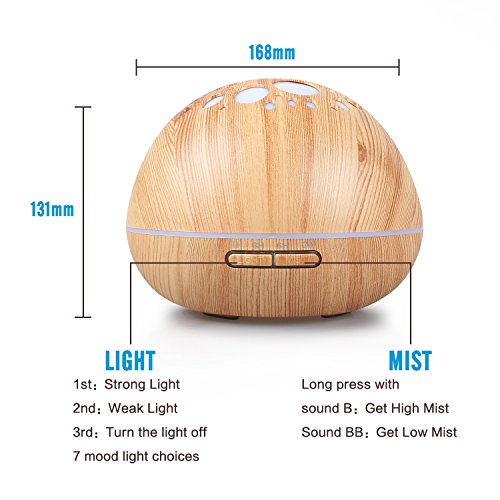 [3 in 1 Function] This Aroma Diffuser is Ultrasonic which will be whisper-quiet when used so that it will create a soft environment for good night’s sleep and pleasant relaxation;The LED lights rotate in 7 soothing colors and each color is adjustable between bright and dim,which can be used as a night light;With Wood Grain looking similar to a acorn it can be a modern and fantastic decoration for your home.