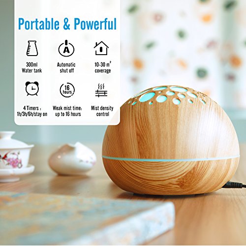 BAYKA Essential Oil Diffuser, 300ml Natural Wood Grain Cashew Nut Shape, Aroma Purifier Ultrasonic Humidifier for Room Waterless Auto Shut-off 4 Timer settings With 7 LED Lights