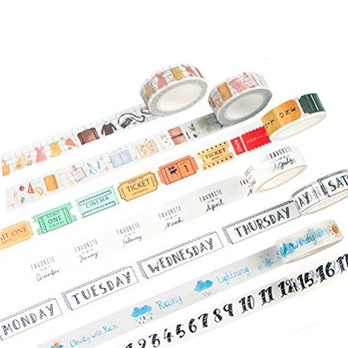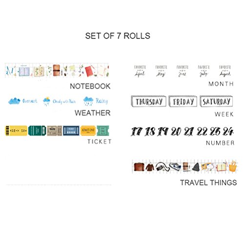 Washi Tape Set of 7 Rolls - Travel bullet Journal Planner Daily Life Diary Number Weather Week Date Notebooks Decorative DIY Japanese Masking Adhesive Sticky Paper Washi Tape Set ( width: 15mm)