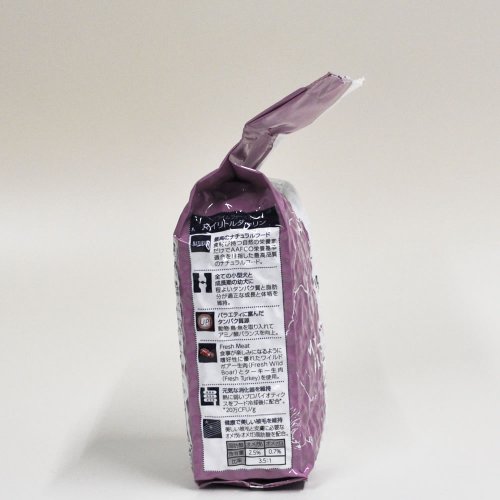 原材料:ワイルドボアー生肉(Fresh Wild Boar)、ターキー生肉(Fresh Turkey)、ポテト、ターキーレバー(Fresh Turkey Liver)、ターキーハート(Fresh Turkey Heart)、えんどう豆、ターキーミール、チキンミール、ポテトプロテイン、メンハーデンミール、鶏脂肪(ビタミンEで酸化対策済)、鶏卵、タラ肝油、トルラ酵母、ビール酵母、えんどう豆繊維、亜麻仁、加水分解チキンエキス、海塩、亜鉛酵母、イヌリン、プロバイオティクス(アシドフィルス菌、カゼイ菌、フェシウム菌)、昆布、酸化防止剤(ローズマリー抽出物)、タウリン、ビタミンE、キレート銅、Lカルニチン、ラクトフェリン、ビタミンC、ユッカ、グレープシード抽出物