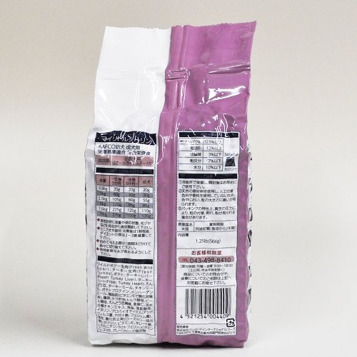 素材構成:AAFCO成犬用栄養基準適合、粗タンパク質-32.5%以上、粗脂肪-13%以上、粗繊維-3%以下、粗灰分-7%以下、水分-10%以下