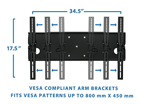 -. Feature : Universal TV wall mounting bracket design fits most of 40-70" LCD/LED/Plasma TVs on the market (even up to some 75 inch TVs) up to VESA 800x450 and 220 lbs (Fits VESA 800x450, 800x400, 750x450, 700x400, 600x450, 600x400, 600x300, 600x200, 400X400, 400X300, 400X200, 300X300, 300X200, 200X200 mm). / This wall mounting kit is compatible with Samsung, Sony, LG, Sharp, Insignia, Vizio, Haier, Toshiba, Sharp, Element, TCL, Westinghouse, RCA 40, 42, 48, 49, 50, 51, 52, 55, 60, 65, 70 and some 80 inch TVs. / Tilt, Swivel, Articulate, Extend, Collapse with this universal TV wall mounting bracket. Full motion capability makes is ideal for corner installation, over a fireplace, inside a TV center. This wall mount is designed for 16 inch studs. TV stays as close as 4 inch from the wall or can extend up to 20.3 inches. Swivel left or right 45 degrees. / Continuous Tilt Feature (up to 15 degrees up or down) for Better Viewing Angle and Reduced Glare. Low-profile design ensures TV is close to the wall for a sleek finish. Very simple to install. / Weight rated to 220 lbs - This bracket is the strongest bracket available on Amazon. Install your precious TV with confidence. Dual arm design prevents sagging that might be visible on lower weight rated and single arm mounts. Constructed from Reinforced Steel. Quick and easy to install - bracket comes complete with full instructions, integrated bubble level and installation hardware.