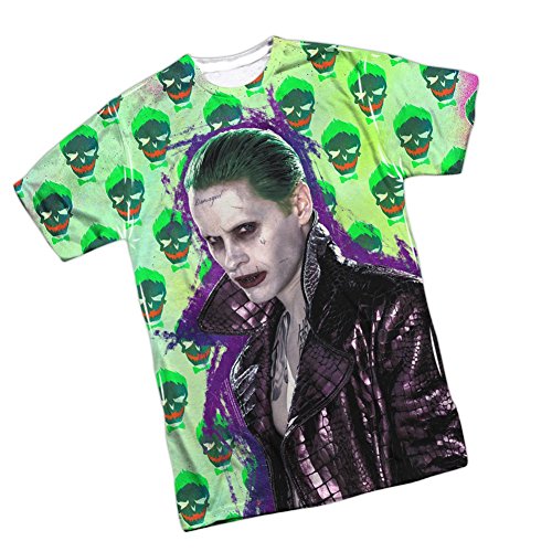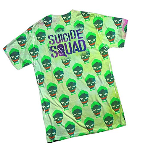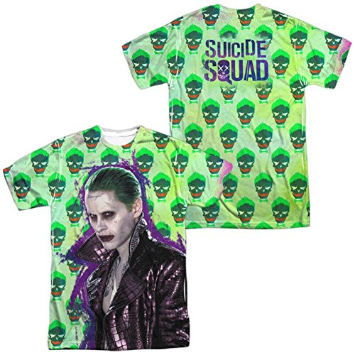 Binding : Apparel Product Description This adult T-shirt is an officially licensed Suicide Squad product from DC Comics, assembled in the USA. The shirt features our cool Joker Jacket Skull all-over front/back design printed on soft 100% polyester sports fabric for maximum moisture control and comfort. This design uses a special sublimation print process. Slight imperfections near folds and seams are expected and make each piece unique. 0