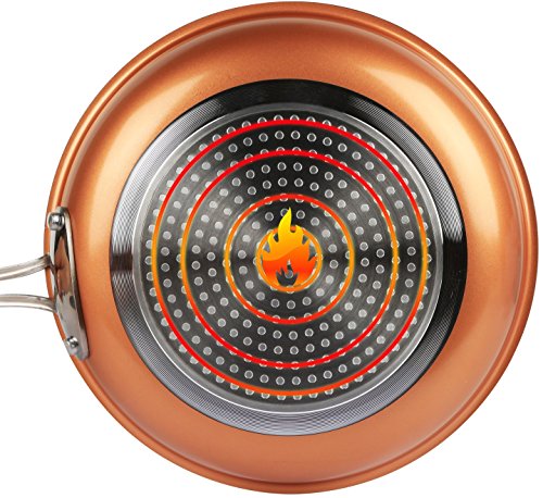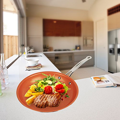 This aluminum frying pan with induction bottom is ideal for electric, induction and gas stoves. You can use it to fry or bake food as you prefer. The ceramic coating free of PTFE, PFOA and PFOS makes for non-stick and easy cleanup. Fast heating and cool down helps save the cooking time. Long handle with dual-riveted allows you to hold this pan firmly and comfortably. In addition, the elegant outlook brings out beautiful a scenery in your kitchen room.