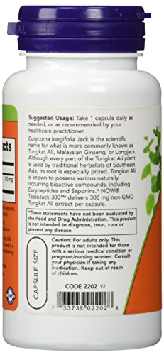 -. Binding : Health and Beauty -. Brand : Now Foods -. Department : men, women -. EAN : 0733739022028 -. Feature : Possesses naturally occurring bioactive compounds / Includes the compounds neuropeptides and saponins / Delivers 300 mg of non-gmo tongkat ali extract per capsule -. IsAdultProduct : 0 -. Label : NOW Foods- Nutrition and Wellness -. LegalDisclaimer :  Contains no:  sugar, salt, yeast, wheat, gluten, soy, milk, egg, shellfish or preservatives.  Vegetarian/Vegan Product.Do Not Eat Freshness Packet.  Keep in Bottle.Caution:  This product is not intended for use by those with a serious medical condition or pregnant or lactating women.  Consult your physician before use. Vcaps® is a registered trademark of Capsugel.Store in a cool, dry place.  Please Recycle. -. Manufacturer : NOW Foods- Nutrition and Wellness -. MPN : 733739022028 -. NumberOfItems : 1 -. PackageQuantity : 1 -. PartNumber : 733739022028 -. ProductGroup : Health and Beauty -. ProductTypeName : HEALTH_PERSONAL_CARE -. PublicationDate : 2015-10-18 -. Publisher : NOW Foods- Nutrition and Wellness -. ReleaseDate : 2015-10-15 -. Size : 60 -. Studio : NOW Foods- Nutrition and Wellness -. Title : Now Foods Testojack 300 V-Caps, 60 Count -. UPC : 733739022028