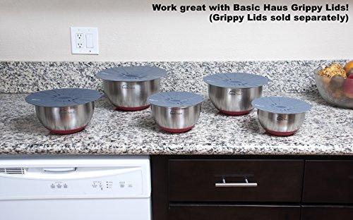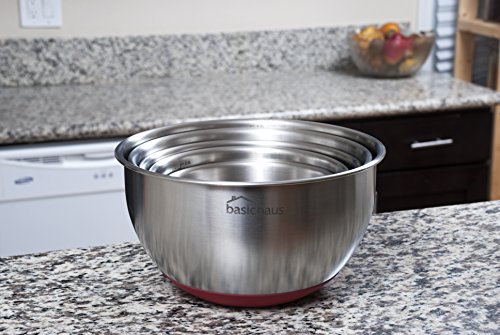 Basic Haus Non Slip Stainless Steel Mixing Bowls - Set of 5 - 1.5, 2, 3, 4 Quarts Plus a Large 5 Quart Bowl - Heavy Duty w/ Red Silicone Bottom - Brushed Finish - Etched Measurement Marks - Stackable