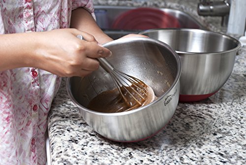 HELP KEEP YOUR KITCHEN SPILL FREE: The eye catching red non slip silicone bottom means your mixing bowl won't slide across the counter when you're trying to cook. Plus, it adds a great splash of color to any kitchen. Why settle for black?