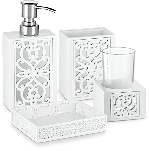 - DURABLE RESIN LUXURY SET this 4-Piece Bathroom Accessory Set is made of durable resin that’s guaranteed to outlast competing products. Our quality resin bath accessories will resist to constant use, keeping their look just as spectacular and luxurious over time.