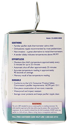 Montiors the child’s temperature approximately every five minutes for up to 25 minutes. Automatic shut-off after approximately 25 minutes. Conforms to the U.S. Consumer Products Safety Commission’s pacifier requirements