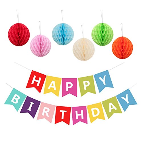 Happy Birthday Decoration Banner With Colorful Tissue Pom Pom Honeycomb Ball 6pcs