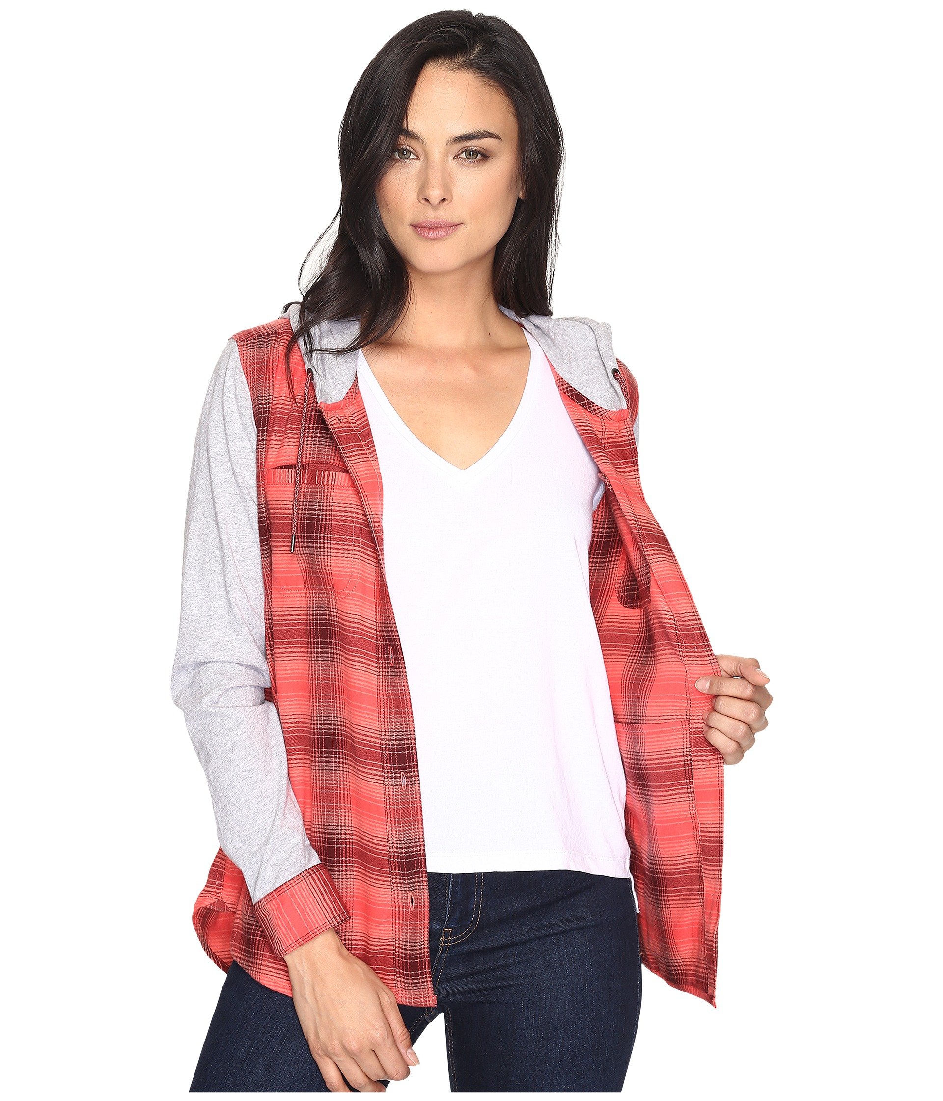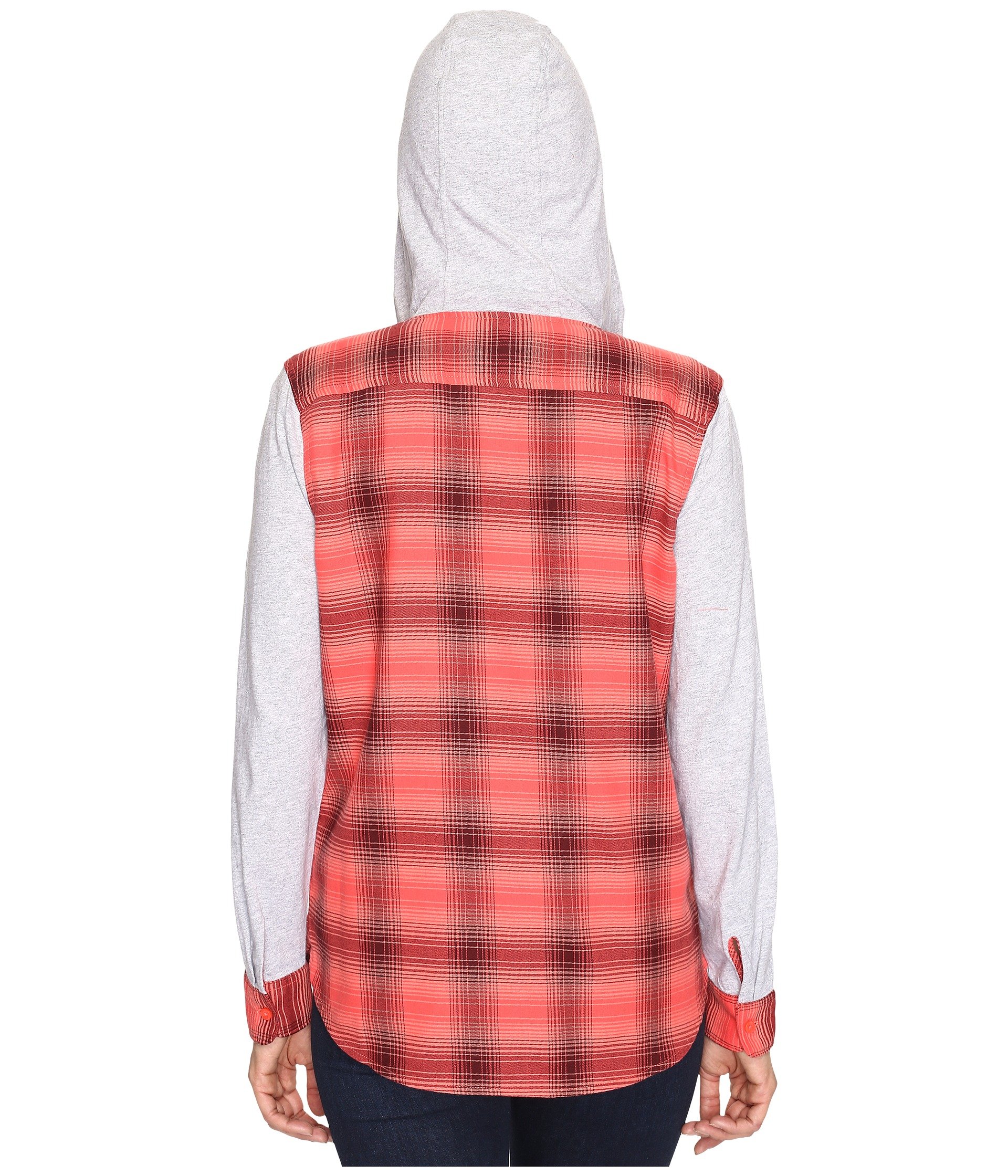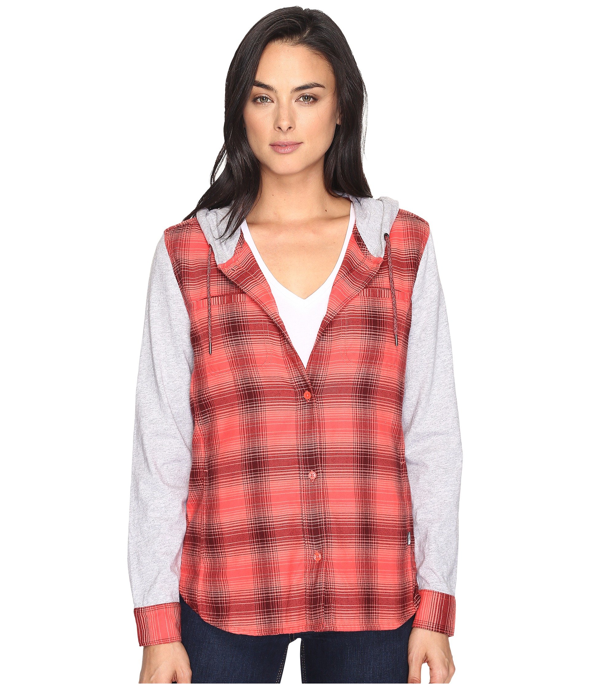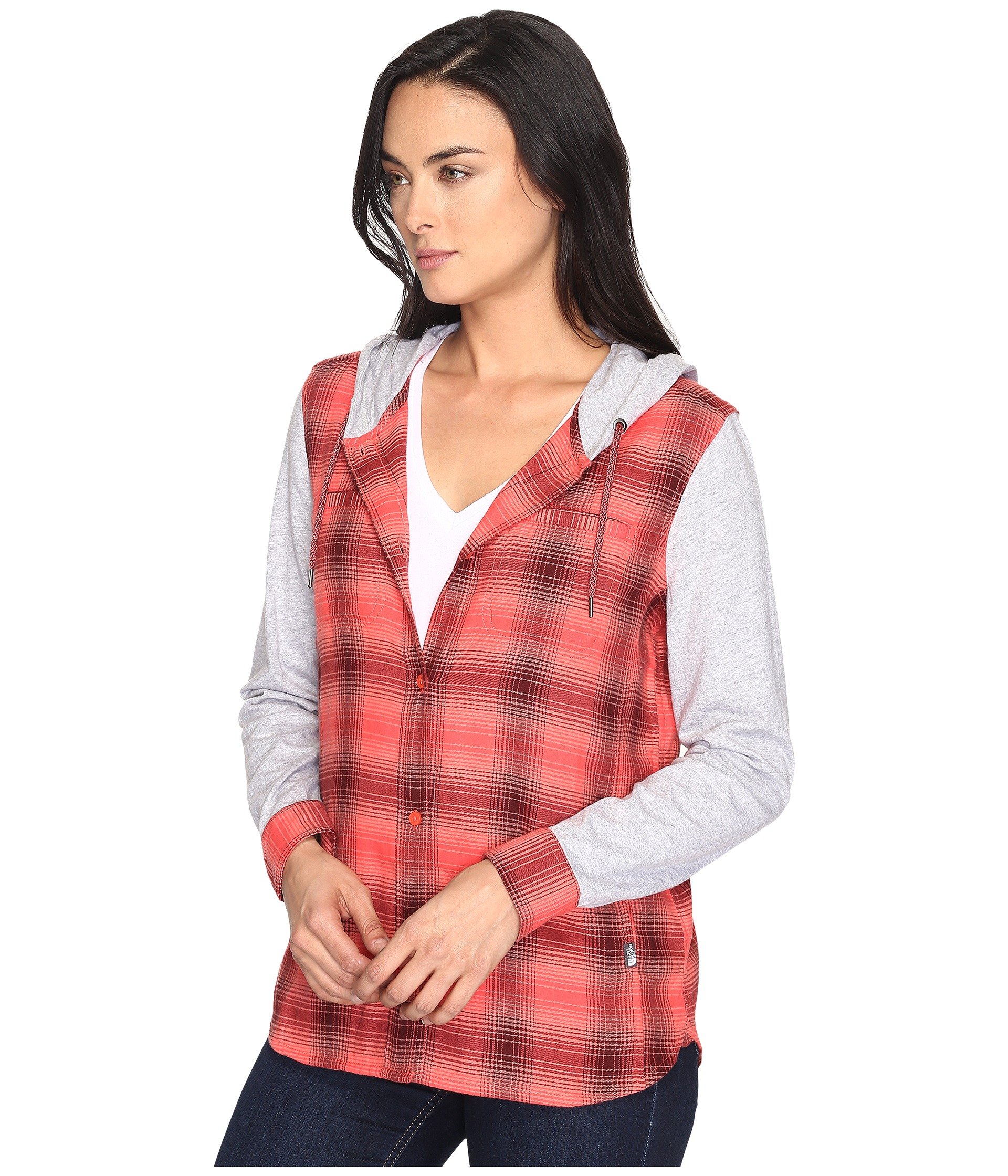 | Product Information SKU: #8801149Please note that this style is either discontinued and/or from a previous season.Whether you're striking camp or settling in around the campfire, the Campground Shacket is an essential piece of cool-weather layering kit.Shirt jacket in a hybrid design and relaxed fit.Hybrid fabrication: ? Hybrid fabrication pairs woven and knit panels. ? Woven body and cuffs in a lightweight, cotton-poly blend. ? Heathered sleeves and hood in a cotton jersey knit.Three-piece hood with adjustable drawstring.Button-up placket.Long sleeves.Buttoned cuffs.On-seam hand pockets.Shirttail hemline with droptail and gusseted side seams.Straight back yoke.Woven: 60% cotton, 40% polyester; Knit: 100% cotton.Machine wash and tumble dry.Imported.Product measurements were taken using size XS. Please note that measurements may vary by size.Measurements: Length: 27 in |