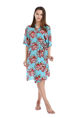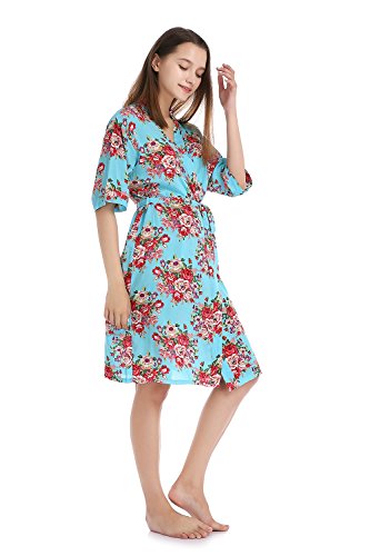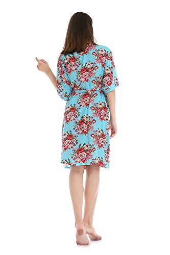 Missfashion Womens Cotton Kimono Robe Floral Wedding Nightgown (S,Light Blue)